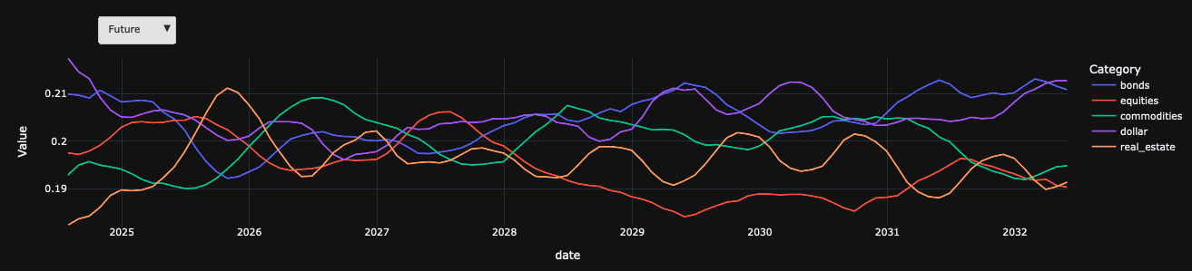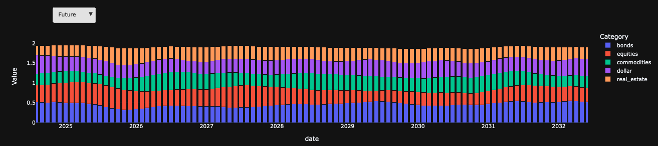 This dataset provides historical and forecasted risk-parity asset allocation data for five major asset classes: bonds, equities, commodities, dollar, and real estate.