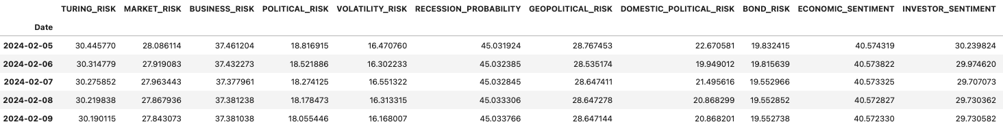 <table><thead><tr><th width="232">Column</th><th>Description</th></tr></thead><tbody><tr><td><code>TURING_RISK</code></td><td>Index combining Market, Business, and Political Risk using scholarly and research data.</td></tr><tr><td><code>MARKET_RISK</code></td><td>Global Value-at-Risk estimate for country indices using various models and an ensemble approach.</td></tr><tr><td><code>BUSINESS_RISK</code></td><td>Index tracking sentiment and conditions across business sectors using surveys, indicators, and news analysis.</td></tr><tr><td><code>POLITICAL_RISK</code></td><td>Index assessing domestic and global policy uncertainty using news, web search data, and reports.</td></tr><tr><td><code>HS</code></td><td>Historical Simulation method for VaR using the empirical distribution of past returns.</td></tr><tr><td><code>MA</code></td><td>Moving Average method for VaR assuming normally distributed returns.</td></tr><tr><td><code>EWMA</code></td><td>Volatility estimation method weighting recent observations more heavily.</td></tr><tr><td><code>GARCH</code></td><td>GJR-GARCH model estimating VaR incorporating responses to positive and negative shocks.</td></tr><tr><td><code>ENSEMBLE</code></td><td>Combined VaR estimate from multiple models to mitigate misspecification.</td></tr><tr><td><code>VIX</code></td><td>Index reflecting expected market volatility over the next 30 days.</td></tr><tr><td><code>SYSTEMIC</code></td><td>Measurement of global financial market interconnectedness using the absorption ratio.</td></tr><tr><td><code>TURBULENCE</code></td><td>Measure of financial turbulence calculated using the Mahalanobis Distance.</td></tr><tr><td><code>RECESSION_6</code></td><td>Six-month recession prediction probability using real-time data and gradient boosting models.</td></tr><tr><td><code>RECESSION_12</code></td><td>Twelve-month recession prediction probability with a proprietary diversification head.</td></tr><tr><td><code>RECESSION_24</code></td><td>Twenty-four-month recession prediction probability using economic and financial variables.</td></tr><tr><td><code>CAPE</code></td><td>Cyclically Adjusted Price-to-Earnings, a long-term stock valuation metric.</td></tr><tr><td><code>NAIIM_NEG</code></td><td>NAAIM Exposure Index reflecting active risk managers' equity market exposure.</td></tr><tr><td><code>AAII_NEG</code></td><td>AAII Sentiment Survey indicating individual investors' market direction opinions.</td></tr><tr><td><code>ADS_BUSINESS_NEG</code></td><td>ADS business conditions index tracking relative performance to average economic conditions.</td></tr><tr><td><code>NONMAN_OUTLOOK_NEG</code></td><td>Survey data on nonmanufacturing sector outlook from the Third Federal Reserve District.</td></tr><tr><td><code>MAN_PHIL_NEG</code></td><td>Monthly manufacturing survey from the Third Federal Reserve District assessing the sector's outlook.</td></tr><tr><td><code>MAN_TEX_NEG</code></td><td>Texas Manufacturing Outlook Survey tracking various sector indicators monthly.</td></tr><tr><td><code>MAN_NY_NEG</code></td><td>Monthly survey measuring manufacturing executives' perspectives in New York State.</td></tr><tr><td><code>CFNAI_FNEG</code></td><td>Composite index based on 85 monthly indicators of national economic activity.</td></tr><tr><td><code>ZEW_SENT_NEG</code></td><td>ZEW Economic Sentiment indicator measuring financial experts' economic outlook expectations.</td></tr><tr><td><code>ATLANTA_UNC</code></td><td>Survey on business uncertainty levels providing insights into economic conditions.</td></tr><tr><td><code>BUILDING_INDEX_NEG</code></td><td>Survey assessing sentiment in the building and construction industry.</td></tr><tr><td><code>CONSUMER_INDEX_NEG</code></td><td>Survey measuring consumer sentiment and perceptions in the economy.</td></tr><tr><td><code>INDUSTRY_INDEX_NEG</code></td><td>Survey capturing sentiment within the industrial sector.</td></tr><tr><td><code>MAIN_INDEX_NEG</code></td><td>Survey monitoring main economic indicators and business sentiment.</td></tr><tr><td><code>RETAIL_INDEX_NEG</code></td><td>Survey gauging sentiment within the retail sector.</td></tr><tr><td><code>SERVICES_INDEX_NEG</code></td><td>Survey measuring sentiment in the services sector.</td></tr><tr><td><code>MICS_ICS_NEG</code></td><td>Michigan series Monthly Indicator of Consumer Sentiment.</td></tr><tr><td><code>MICS_ICC_NEG</code></td><td>Michigan series Monthly Indicator of Consumer Confidence.</td></tr><tr><td><code>MICS_ICE_NEG</code></td><td>Michigan series Monthly Indicator of Consumer Expectations.</td></tr><tr><td><code>NEWS_SENT_NEG</code></td><td>Daily measure of economic sentiment from news articles.</td></tr><tr><td><code>TERM_SPREAD</code></td><td>Indicator representing the yield difference between long-term and short-term government bonds.</td></tr><tr><td><code>CREDIT_SPREAD</code></td><td>Measure of yield difference between below and above investment-grade bonds.</td></tr><tr><td><code>CORP_BOND_DISTRESS</code></td><td>Index quantifying distress in the corporate bond market.</td></tr><tr><td><code>MISERY_INDEX</code></td><td>Economic indicator combining unemployment and inflation rates.</td></tr><tr><td><code>HOUSING_AFFORD_NEG</code></td><td>Index measuring the affordability of housing.</td></tr><tr><td><code>NEW_TRUCKS</code></td><td>Sales data for heavy trucks above 14,000 pounds.</td></tr><tr><td><code>NEW_HOMES</code></td><td>Data on newly authorized housing units.</td></tr><tr><td><code>CFSEC_NEG</code></td><td>Diffusion indexes reflecting changes in organizations' operations and outlook.</td></tr><tr><td><code>US_POLICY_UNC_D</code></td><td>Daily Economic Policy Uncertainty Index based on American newspaper counts.</td></tr><tr><td><code>UK_POLICY_UNC_D</code></td><td>Daily Economic Policy Uncertainty Index based on British</td></tr><tr><td><code>CHINA_POLICY_UNC_M</code></td><td>Monthly index tracking economic policy uncertainty in China based on term frequency in Chinese new