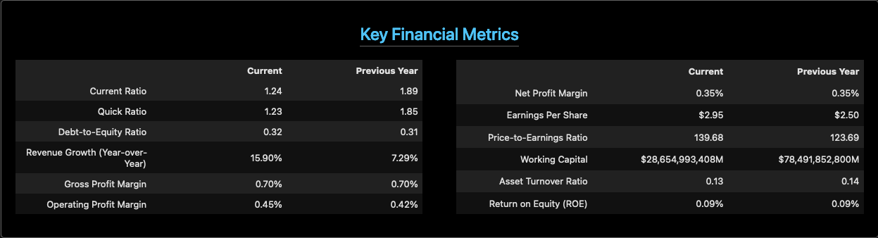 <table><thead><tr><th width="204">name</th><th width="318">description</th><th width="130">domain</th><th width="140">characteristic</th></tr></thead><tbody><tr><td>working_capital</td><td>Working capital is the net amount of [current_assets] minus [current_liabilities], giving an indication of the short-term financial health of a company.</td><td>Metrics</td><td>Assets</td></tr><tr><td>ticker</td><td>A ticker symbol, often referred to as a stock symbol, is a unique [entity] that identifies a publicly traded security in financial markets</td><td>Entity</td><td>Entity</td></tr><tr><td>tax_liabilities</td><td>On the [balance sheet], this line item represents the total amount of tax obligations due, included within [total_liabilities], that the company is responsible for paying</td><td>Balance Sheet</td><td>Liabilities</td></tr><tr><td>tax_expenses</td><td>This represents the sum of current and deferred income tax expenses related to ongoing operations, as reported on the [income statement]. It reflects the company's tax liabilities for the period.</td><td>Income Statement</td><td>Expense</td></tr><tr><td>tax_assets</td><td>Tax assets, listed on the [balance sheet], include all tax-related receivables and potential tax benefits that are recognized as part of [total_assets].</td><td>Balance Sheet</td><td>Assets</td></tr><tr><td>tangible_assets</td><td>The value of a company's physical assets, or [tangible_assets], is calculated by subtracting [intangible_assets] from [total_assets], as indicated in [metrics].</td><td>Metrics</td><td>Assets</td></tr><tr><td>selling_general_admin_expenses</td><td>This [income statement] entry sums up all costs associated with selling the company's products and managing its operations, excluding production costs. It includes both direct selling expenses and broader administrative costs.</td><td>Income Statement</td><td>Expense</td></tr><tr><td>stock_based_compensation</td><td>This item on the [cash flow statement] reflects compensation given to employees in the form of equity or options, which is considered noncash and therefore added back to net cash from operating activities.</td><td>Cash Flow Statement</td><td>Cash Flow</td></tr><tr><td>research_development_expenses</td><td>This [income statement] line item tallies up all expenses associated with the development of new products or services, reflecting a company's investment in innovation.</td><td>Income Statement</td><td>Expense</td></tr><tr><td>revenue_usd</td><td>This [income statement] figure represents [total_revenue] converted into USD, using the [forex_usd] exchange rate, to standardize international revenue figures.</td><td>Income Statement</td><td>Income</td></tr><tr><td>total_revenue</td><td>The total amount recognized from providing goods and services, as seen on the [income statement], it's a fundamental gauge of the company's financial performance.</td><td>Income Statement</td><td>Income</td></tr><tr><td>retained_earnings</td><td>[balance sheet] Represents the cumulative earnings or deficit that an entity has retained over time as part of [total_equity]. This may be reported annually for some entities.</td><td>Balance Sheet</td><td>Equity</td></tr><tr><td>accounts_receivable</td><td>[balance sheet] Includes all trade and non-trade receivables as part of [total_assets], signifying amounts owed to the entity that are expected to be collected.</td><td>Balance Sheet</td><td>Assets</td></tr><tr><td>preferred_dividends</td><td>[income statement] Reflects dividends paid to preferred stockholders, deducted from [net_income] to determine the earnings available to common stockholders.</td><td>Income Statement</td><td>Expense</td></tr><tr><td>property_plant_equipment_net</td><td>[balance sheet] The net value of a company's investment in physical assets used in operations, net of depreciation and including Operating Right of Use Assets.</td><td>Balance Sheet</td><td>Assets</td></tr><tr><td>accounts_payable</td><td>[balance sheet] Represents amounts the company owes to suppliers and creditors, forming part of [total_liabilities].</td><td>Balance Sheet</td><td>Liabilities</td></tr><tr><td>operating_income</td><td>[income statement] Shows a company's earnings from core operations, derived as [gross_profit] minus [operating_expenses], excluding [interest_expense] and [tax_expenses].</td><td>Income Statement</td><td>Income</td></tr><tr><td>operating_expenses</td><td>[income statement] Encompasses all costs related to the day-to-day functioning of the business, excluding costs directly tied to production ([cost_of_revenue]).</td><td>Income Statement</td><td>Expense</td></tr><tr><td>net_income_non_controlling_int</td><td>[income statement] Reflects the share of earnings allocated to minority shareholders, deducted from [consolidated_income] to arrive at [net_income].</td><td>Income Statement</td><td>Income</td></tr><tr><td>net_income_discontinued_ops</td><td>[income statement] Represents the financial impact of ceasing operations or disposing of a part of the business, shown separately from ongoing operations.</td><td>Income Statement</td><td>Income</td></tr><tr><td>net_income_common_stock_usd</td><td>[income statement] The portion of [net_income_common_stock] presented in USD, converted using [forex_usd].</td><td>Income Statement</td><td>Income</td></tr><tr><td>net_income_common_stock</td><td>[income statement] The total earnings attributable to common shareholders, which may differ from [net_income] due to [preferred_dividends].</td><td>Income Statement</td><td>Income</td></tr><tr><td>net_income</td><td>[income statement] The total earnings or losses for the period attributable to the parent company, after accounting for non-controlling interests and before preferred dividends.</td><td>Income Statement</td><td>Income</td></tr><tr><td>net_cash_flow_fx</td><td>[cash flow statement] Reflects the impact of foreign exchange rate movements on the company's cash and cash equivalents held in different currencies.</td><td