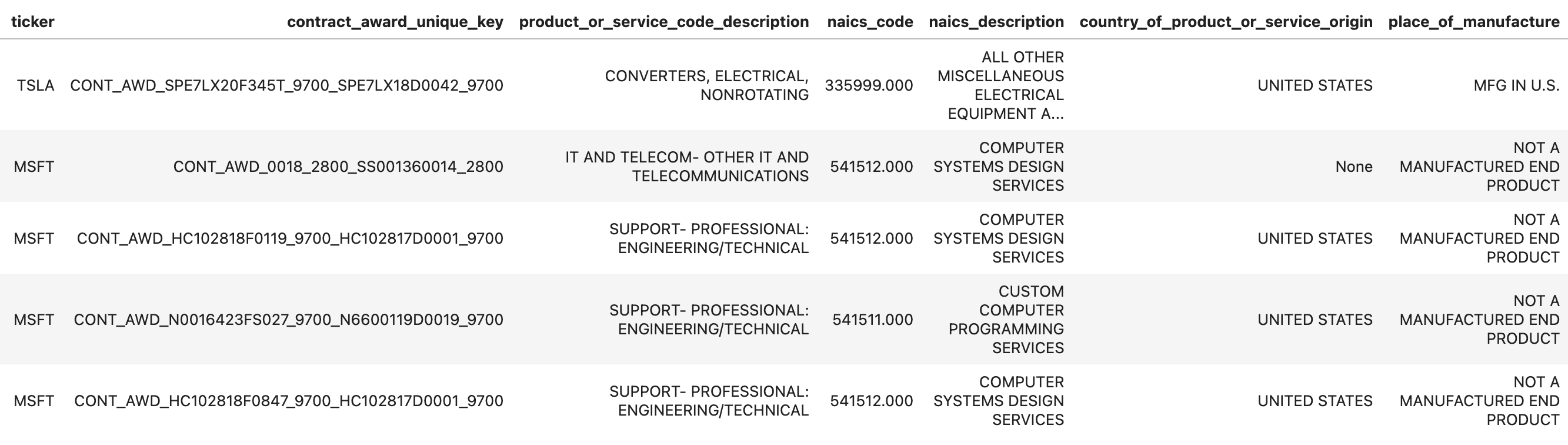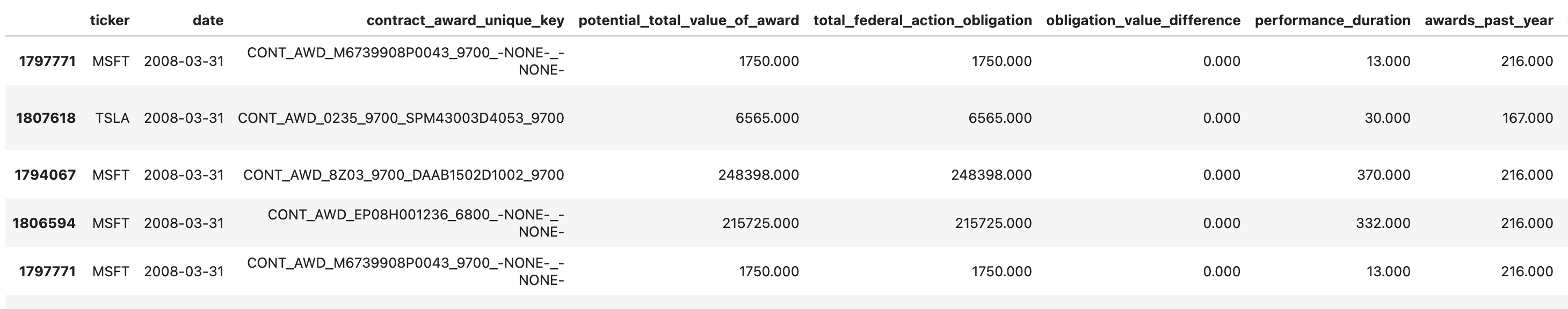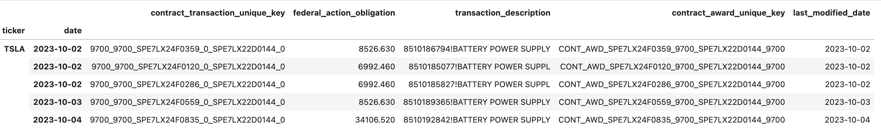 <table><thead><tr><th width="258">Column Name</th><th width="268">Description</th><th>Example</th></tr></thead><tbody><tr><td>ticker</td><td>Stock ticker symbol identifying the company.</td><td>TSLA</td></tr><tr><td>date</td><td>Date of the record.</td><td>2023-10-02</td></tr><tr><td>contract_award_unique_key</td><td>Unique key identifying the prime award.</td><td>CONT_AWD_SPE7LX24F0359_9700_SPE7LX22D0144_9700</td></tr><tr><td>potential_total_value_of_award</td><td>Total amount that could be obligated on a contract if all options are exercised.</td><td>8526.629883</td></tr><tr><td>total_federal_action_obligation</td><td>Total value of federal obligations for the contract.</td><td>8526.629883</td></tr><tr><td>obligation_value_difference</td><td>Difference between the total federal action obligation and the potential total value of the award.</td><td>0.0</td></tr><tr><td>performance_duration</td><td>Duration of the contract's performance period in days.</td><td>30.0</td></tr><tr><td>awards_past_year</td><td>Count of awards per recipient name in the past year.</td><td>7.0</td></tr><tr><td>transactions_per_award</td><td>Count of unique transactions per award.</td><td>1.0</td></tr><tr><td>prime_award_base_transaction_description</td><td>Description of the transaction or award at the prime award level.</td><td>8510186794!BATTERY POWER SUPPLY</td></tr><tr><td>period_of_performance_start_date</td><td>Agreed start date for the contract's requirements.</td><td>2023-10-02</td></tr><tr><td>period_of_performance_current_end_date</td><td>Scheduled completion date for the contract.</td><td>2023-11-01</td></tr><tr><td>period_of_performance_potential_end_date</td><td>Date when awardee effort is completed if all potential options were exercised.</td><td>2023-11-01</td></tr><tr><td>extension_days_available</td><td>Number of days available for extension.</td><td>0.0</td></tr><tr><td>time_to_start_performance</td><td>Number of days between the action date and the period of performance start date.</td><td>0.0</td></tr><tr><td>modification_number</td><td>Identifier of an action indicating the specific change to the initial award.</td><td>0</td></tr><tr><td>last_modified_date</td><td>The date capturing the change or modification.</td><td>2023-10-02</td></tr><tr><td>recipient_name</td><td>The name of the awardee or recipient associated with the unique identifier.</td><td>TESLA INDUSTRIES, INC.</td></tr><tr><td>recipient_uei</td><td>Unique Entity Identifier of the recipient organization.</td><td>WK5RYJL58YY9</td></tr></tbody></table>