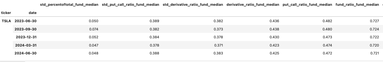 <table><thead><tr><th width="340">Name</th><th width="329">Description</th><th>Type</th></tr></thead><tbody><tr><td>std_percentoftotal_fund_median</td><td>Rolling standard deviation of 'percentoftotal' over the last 4 quarters for each investor.</td><td>float64</td></tr><tr><td>std_put_call_ratio_fund_median</td><td>Rolling standard deviation of the put-call ratio over the last 4 quarters for each investor.</td><td>float64</td></tr><tr><td>std_derivative_ratio_fund_median</td><td>Rolling standard deviation of the derivative ratio over the last 4 quarters for each investor.</td><td>float64</td></tr><tr><td>derivative_ratio_fund_median</td><td>Ratio of the sum of put value and call value to share value for each investor.</td><td>float64</td></tr><tr><td>put_call_ratio_fund_median</td><td>Put-call ratio calculated as the difference between put value and call value divided by their sum for each investor.</td><td>float64</td></tr><tr><td>fund_ratio_fund_median</td><td>Ratio of fund value to share value for each investor.</td><td>float64</td></tr><tr><td>debt_ratio_fund_median</td><td>Ratio of debt value to share value for each investor.</td><td>float64</td></tr><tr><td>preferred_ratio_fund_median</td><td>Ratio of preferred stock value to share value for each investor.</td><td>float64</td></tr><tr><td>totalvalue_median</td><td>Median of the total value of holdings for each investor.</td><td>float64</td></tr><tr><td>percentoftotal_median</td><td>Median of the percentage of total holdings for each investor.</td><td>float64</td></tr><tr><td>shrholdings_growth_median</td><td>Median of the percentage growth in shareholdings for each investor.</td><td>float64</td></tr><tr><td>totalvalue_growth_median</td><td>Median of the percentage growth in total value for each investor.</td><td>float64</td></tr><tr><td>put_call_ratio_fund_growth_median</td><td>Median of the percentage growth in put-call ratio for each investor.</td><td>float64</td></tr><tr><td>derivative_ratio_fund_growth_median</td><td>Median of the percentage growth in derivative ratio for each investor.</td><td>float64</td></tr><tr><td>market_tilt_pca_median</td><td>Median of the market tilt component calculated through PCA for each investor.</td><td>float64</td></tr><tr><td>sector_tilt_pca_median</td><td>Median of the sector tilt component calculated through PCA for each investor.</td><td>float64</td></tr><tr><td>strategy_tilt_pca_median</td><td>Median of the strategy tilt component calculated through PCA for each investor.</td><td>float64</td></tr><tr><td>quantitative_tilt_pca_median</td><td>Median of the quantitative tilt component calculated through PCA for each investor.</td><td>float64</td></tr><tr><td>instrument_tilt_pca_median</td><td>Median of the instrument tilt component calculated through PCA for each investor.</td><td>float64</td></tr><tr><td>weight_variability_median</td><td>Median of the variability in weightings for each investor's portfolio.</td><td>float64</td></tr><tr><td>weight_mean_median</td><td>Median of the mean weights of holdings in each investor's portfolio.</td><td>float64</td></tr><tr><td>weight_coff_variance_median</td><td>Median of the coefficient of variance of weights in each investor's portfolio (variability relative to mean weight).</td><td>float64</td></tr><tr><td>weight_max_median</td><td>Median of the maximum weight in each investor's portfolio.</td><td>float64</td></tr><tr><td>weight_kurtosis_median</td><td>Median of the kurtosis of weights in each investor's portfolio (measure of the 'tailedness' of the distribution of weights).</td><td>float64</td></tr><tr><td>weight_skew_median</td><td>Median of the skewness of weights in each investor's portfolio (measure of asymmetry of the distribution of weights).</td><td>float64</td></tr><tr><td>num_investments_median</td><td>Median number of investments in each investor's portfolio.</td><td>float64</td></tr><tr><td>new_investments_median</td><td>Median ratio of new investments to total investments in each investor's portfolio.</td><td>float64</td></tr><tr><td>divestments_median</td><td>Median ratio of divestments to total investments in each investor's portfolio.</td><td>float64</td></tr><tr><td>new_investments_to_divestments_median</td><td>Median ratio of new investments to divestments in each investor's portfolio.</td><td>float64</td></tr><tr><td>portfolio_turnover_median</td><td>Median portfolio turnover, measuring changes in portfolio composition, for each investor.</td><td>float64</td></tr><tr><td>net_change_to_investments_median</td><td>Median of the net change to investments, indicating the net inflow or outflow, in each investor's portfolio.</td><td>float64</td></tr><tr><td>uncorrelated_percentile_median</td><td>Median of the uncorrelated percentile, indicating the degree of uncorrelation in each investor's portfolio components.</td><td>float64</td></tr><tr><td>flow_percentage_mean_median</td><td>Median of the mean flow percentage, indicating the average flow relative to the value, in each investor's portfolio.</td><td>float64</td></tr><tr><td>performance_value_mean_median</td><td>Median of the mean performance value, indicating the average value of performance, in each investor's portfolio.</td><td>float64</td></tr><tr><td>fund_return_quarter_median</td><td>Median return of funds for each investor, calculated quarterly.</td><td>float64</td></tr><tr><td>fund_flows_percent_quarter_median</td><td>Median percentage of fund flows for each investor, calculated quarterly.</td><td>float64</td></tr><tr><td>std_percentoftotal_fund_std</td><td>Standard deviation of the rolling standard deviation of 'percentoftotal' over the last 4 quarters for each investor.</td><td>float64</td></tr><tr><td>std_put_call_ratio_fund_std</td><td>Standard deviation of the rolling standard deviation of the put-call ratio over the last 4 quarters for each investor.</td><td>float64</td></tr><tr><td>std_derivative_ratio_fund_std</td><td>Standard deviation of the rolling standard deviation 