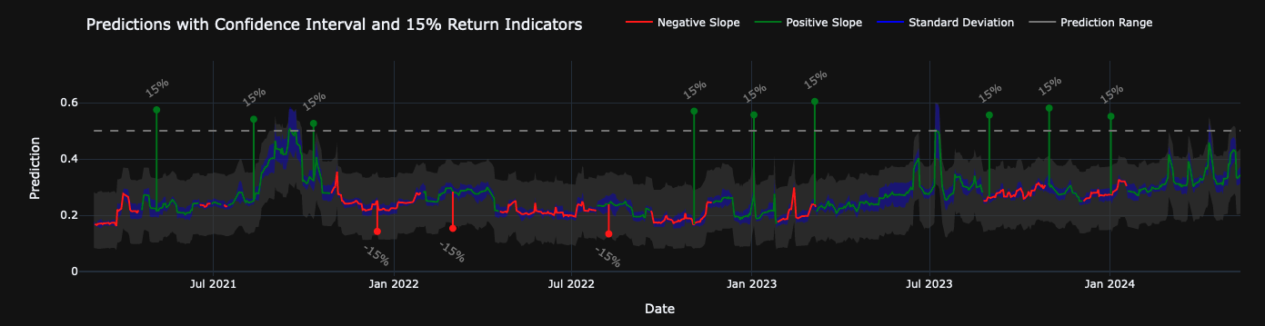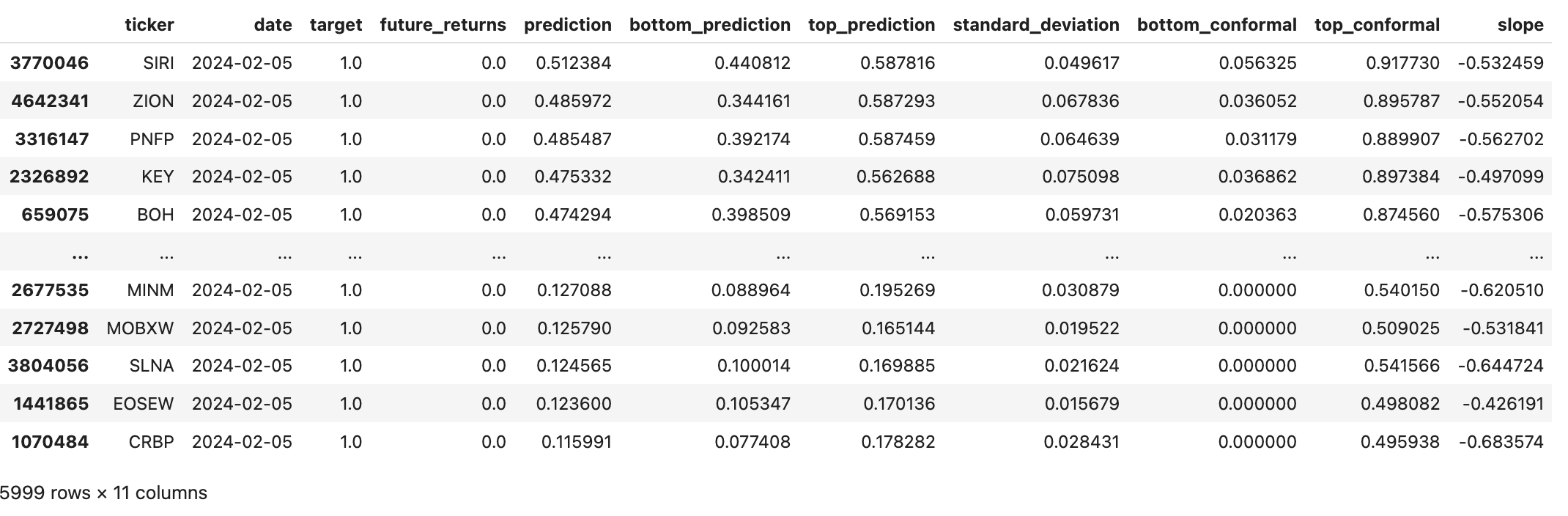 <table><thead><tr><th width="237">Column</th><th>Description</th><th>Type</th><th>Example</th></tr></thead><tbody><tr><td><code>ticker</code></td><td>Stock ticker symbol.</td><td>object</td><td>"AAPL"</td></tr><tr><td><code>date</code></td><td>Date when the data was recorded.</td><td>datetime64[ns]</td><td>2023-09-30</td></tr><tr><td><code>target</code></td><td>Target variable for predictions.</td><td>float64</td><td>0.05</td></tr><tr><td><code>future_returns</code></td><td>Future returns of the stock.</td><td>float32</td><td>0.10</td></tr><tr><td><code>prediction</code></td><td>Predicted probability from the model.</td><td>float64</td><td>1.25</td></tr><tr><td><code>bottom_prediction</code></td><td>Lower bound of the prediction interval.</td><td>float64</td><td>1.20</td></tr><tr><td><code>top_prediction</code></td><td>Upper bound of the prediction interval.</td><td>float64</td><td>1.30</td></tr><tr><td><code>standard_deviation</code></td><td>Standard deviation of the predictions.</td><td>float64</td><td>0.02</td></tr><tr><td><code>bottom_conformal</code></td><td>Lower bound of the conformal prediction interval.</td><td>float64</td><td>1.18</td></tr><tr><td><code>top_conformal</code></td><td>Upper bound of the conformal prediction interval.</td><td>float64</td><td>1.32</td></tr><tr><td><code>slope</code></td><td>Slope derived from the rolling regression of predictions over a window.</td><td>float64</td><td>0.003</td></tr></tbody></table>