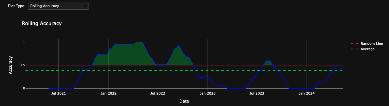 The accuracy is around 65% and ROC-AUC of 68%, it is one of the most accurate breakout models on the market. It is retrained on a weekly basis.